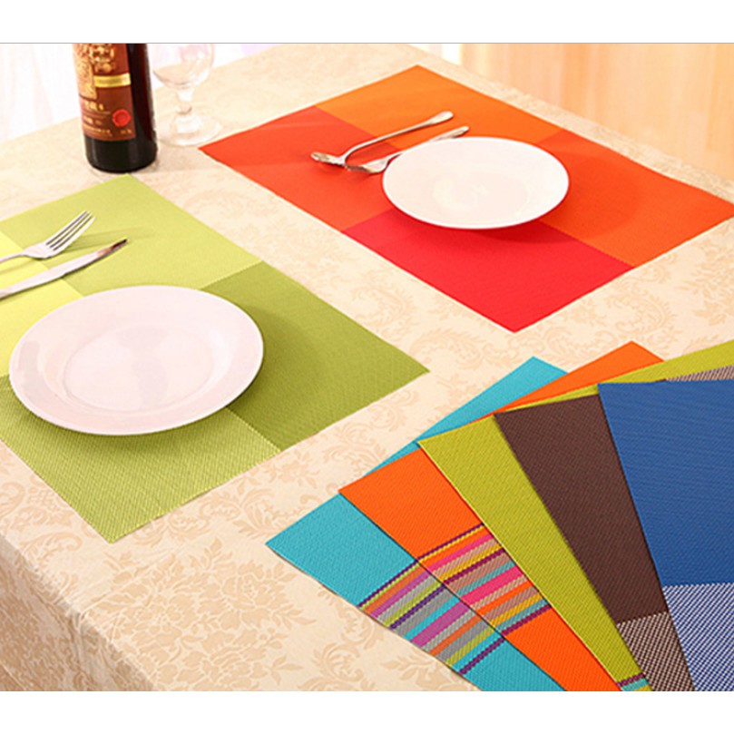 ready warnahitambiruorangehijauungumerahTatakan piring cantik dengan kombinasi warna menarik. Cocok untuk pelengkap meja makan, kesannya modern. Dari bahan pvc ringan, tahan panas.Size : 45 x 30 cmMotif : Kotak-kotak